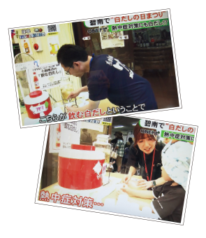 今年で14回目を迎える「白だしの日まつり」の様子が紹介されました。会場で振舞われた七福醸造の「飲む白だし」は、天日塩を使っているから暑い夏の塩分補給&水分補給にピッタリ。夏の新感覚ドリンクとしてオススメしてもらえました。スタジオで試飲された恩田アナと村瀬先生からも「だし旨で飲みやすい♪」の嬉しいコメントいただきました。